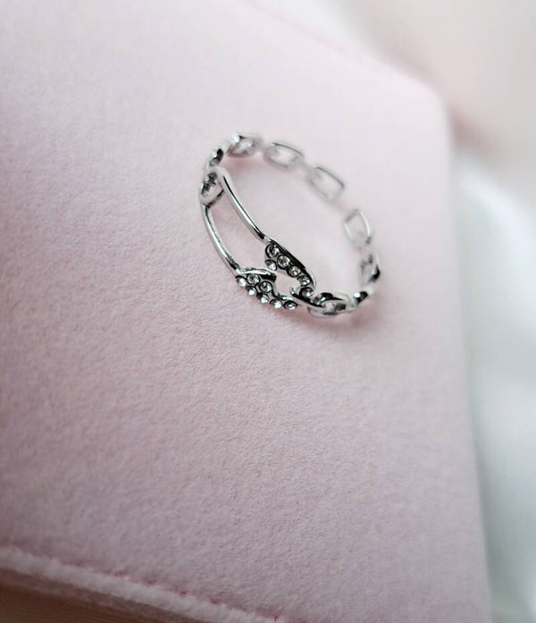 Bague fine en acier inoxydable composée de maillons et d'une épingle sertie de zirconiums.