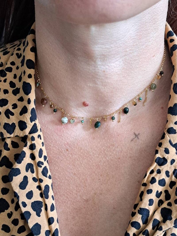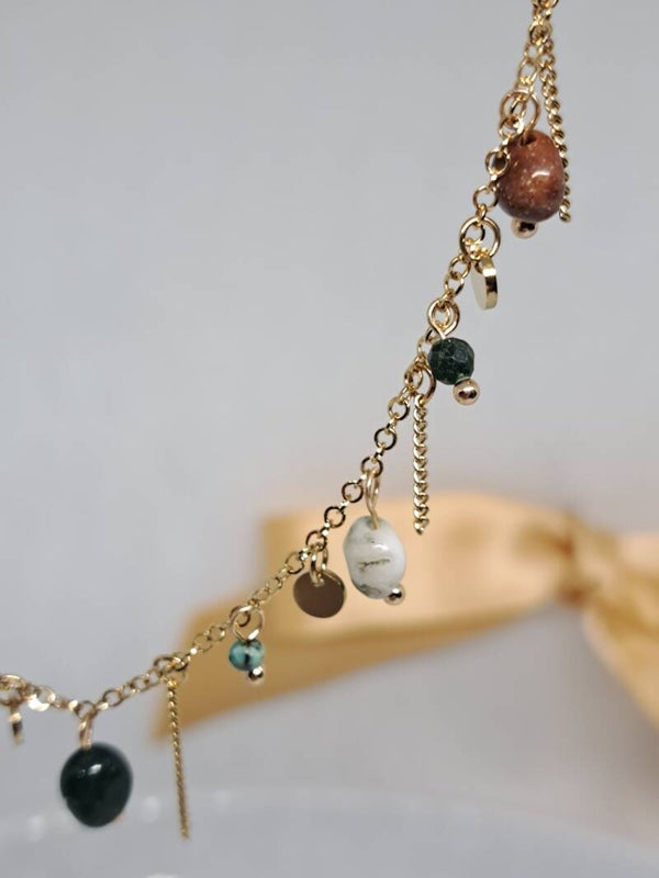 Collier sur chaîne en acier inoxydable composé de pierres naturelles et de pampilles rondes.