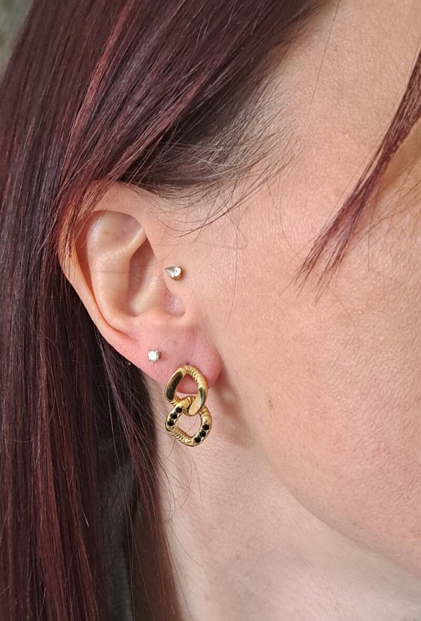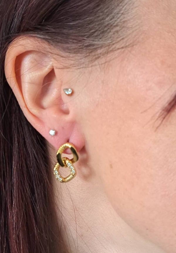 Boucles d'oreilles à puce en acier inoxydable composées d'un double anneau losange lisse et strié, serti d'oxydes de zirconium.