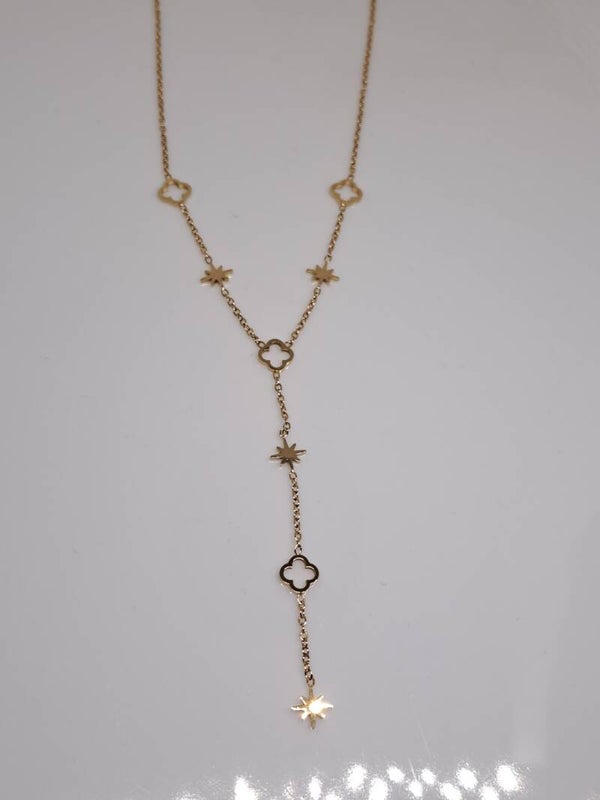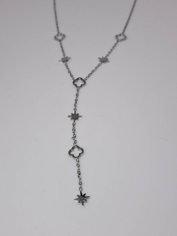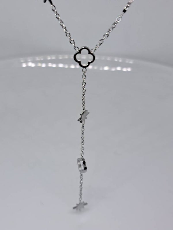 Ce collier en forme de “Y” en acier inoxydable est une véritable déclaration de style. Orné de petites décorations géométriques, incluant des étoiles et des trèfles, il combine simplicité et modernité. La chaîne délicate se termine par un pendentif en forme d’étoile, ajoutant une touche de charme et de sophistication.