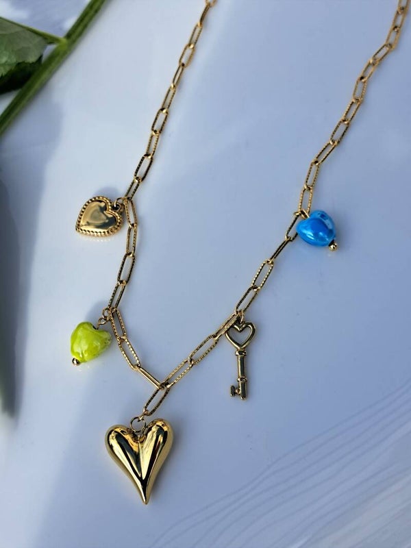 cœurs colorés, clé précieuse et pendentif cœur central au design raffiné. Léger, tendance et résolument romantique, ce bijou mixe à la perfection douceur et caractère. Il sublimera votre tenue, que ce soit pour un look casual chic ou une touche glamour en soirée.